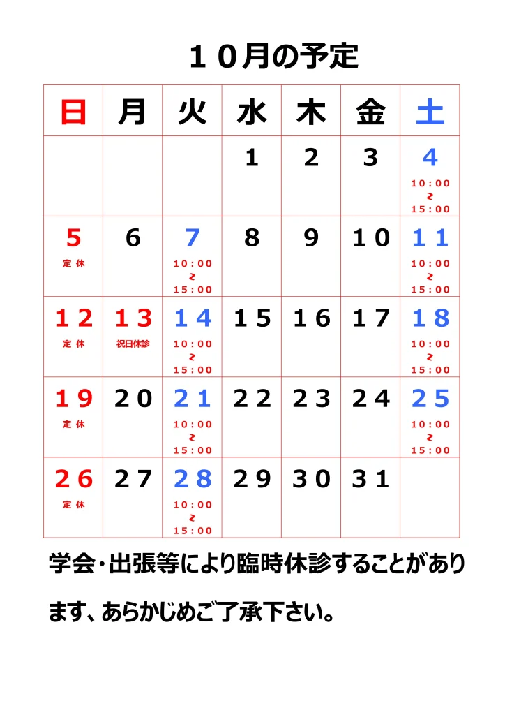 令和7年10月営業日のお知らせです。